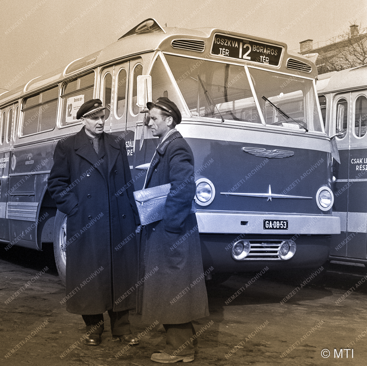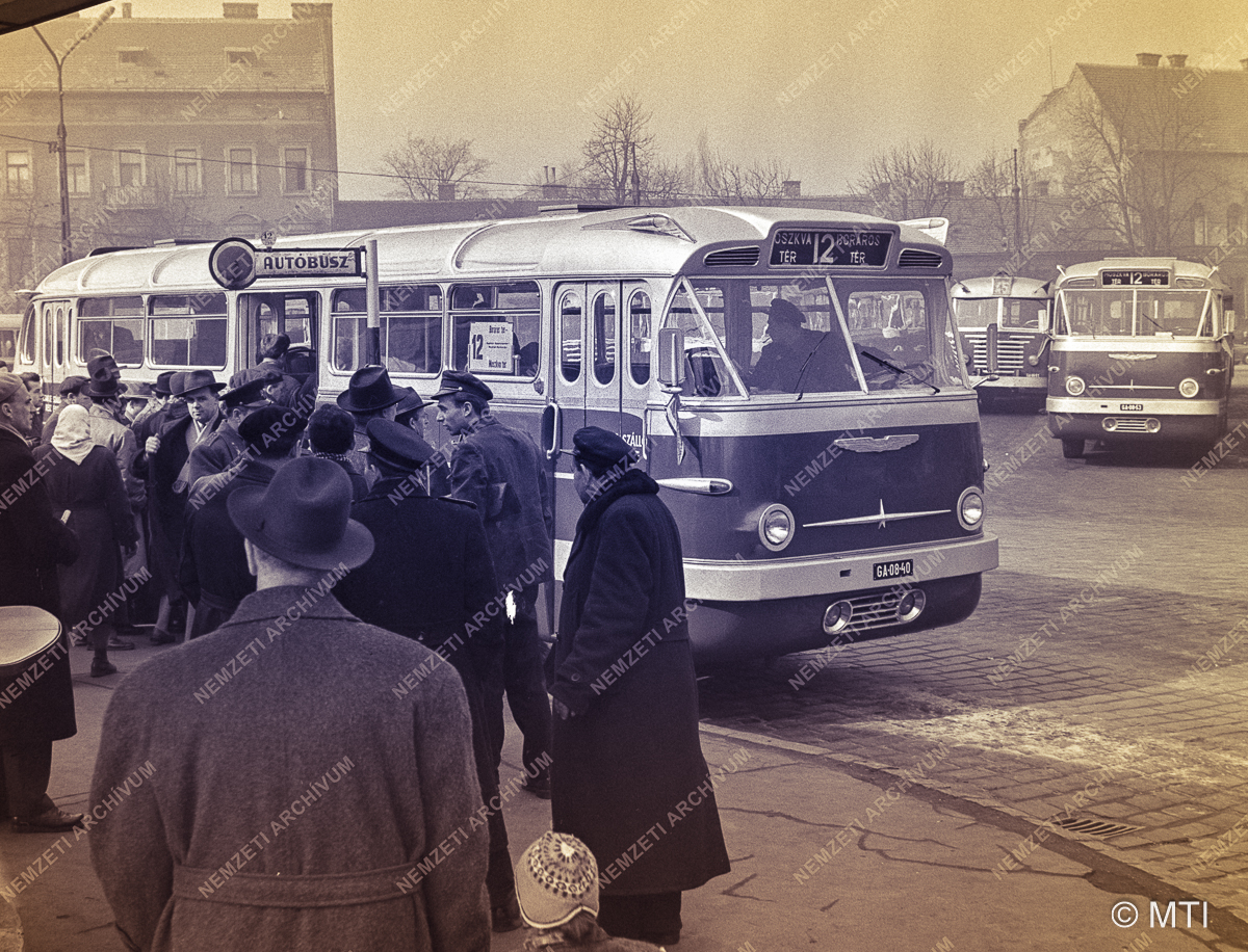 Új, 12-es jelzésű óriás autóbuszok a Moszkva téri végállomáson. Az április 4-re felajánlott húsz új autóbuszt jóval a határidő előtt, március 20-ra készítette el az Ikarus-gyár. A Moszkva tér és a Boráros tér közt, a Nagykörúton közlekedő buszokat március 21-én hajnalban, a Tanácsköztársaság kikiáltásának 40. évfordulóján, 12-es jelzéssel állították forgalomba.